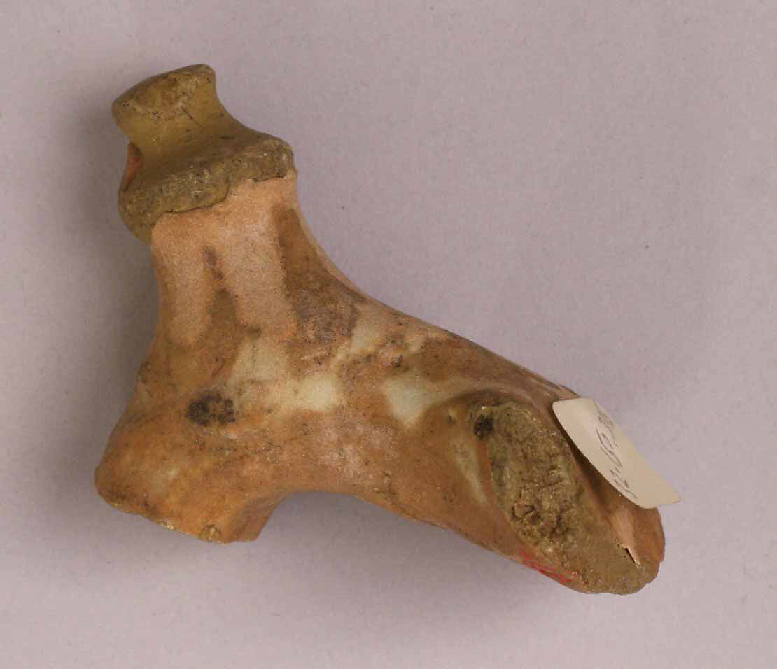 Finds like this fragment, which was excavated at a site named Selman Pak V, attest to the continued occupation of Ctesiphon’s urban area in the early Islamic period. The handle would have originally belonged to a ewer or a jug, glazed with an opacified white glaze, and luster-painted in a greenish-gold color. Thumb rests, sometimes in the shape of an animal or a turban, are commonly found on unglazed ceramics of the 9th to 11th centuries.