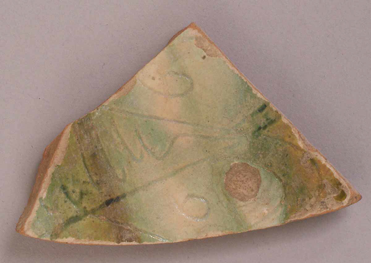 This ceramic fragment was excavated in Ctesiphon, the Sasanian metropolis and administrative capital conquered by Arab Muslim armies in 637. The city continued to be inhabited throughout the era, when it was known in Arabic as al-Mada’in, or "the cities", because of the expansive area it encompassed. Arab and Persian historians and poets indulged in describing al-Mada’in/Ctesiphon’s grand monuments. Muslim rulers also celebrated the glory of these monuments, which through time had acquired symbolic significance due to their association with the city’s imperial past. This was the case of the Taq-i Kisra, an impressive colossal ivan (a vaulted hall with one side open) that was partially dismantled to reuse its bricks in caliphal buildings in the new capital of Baghdad.