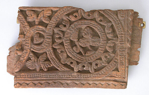 This wooden panel is strikingly well preserved. Its carved decoration fits well into the artistic productions of the very first centuries of the Islamic era, while a number of elements are evocative of Sasanian-period visual language. These include the draped bands enclosing the central half-medallion, which recall both the flying scarf of geese depicted on stucco decoration and textiles, as well as the headdress of Sasanian emperors reproduced on coinage. Polylobate arches, double colonnette, ribbed columns, and crested crenellations are similarly evocative of Late Antique and Sasanian architecture and appear in early Islamic buildings and their depiction.