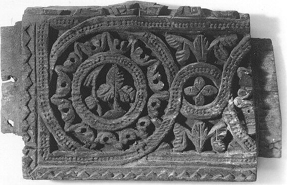This wooden panel is strikingly well preserved. Its carved decoration fits well into the artistic productions of the very first centuries of the Islamic era, while a number of elements are evocative of Sasanian-period visual language. These include the draped bands enclosing the central half-medallion, which recall both the flying scarf of geese depicted on stucco decoration and textiles, as well as the headdress of Sasanian emperors reproduced on coinage. Polylobate arches, double colonnette, ribbed columns, and crested crenellations are similarly evocative of Late Antique and Sasanian architecture and appear in early Islamic buildings and their depiction.