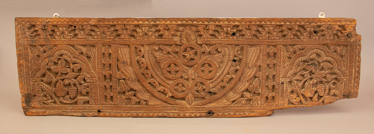 This wooden panel is strikingly well preserved. Its carved decoration fits well into the artistic productions of the very first centuries of the Islamic era, while a number of elements are evocative of Sasanian-period visual language. These include the draped bands enclosing the central half-medallion, which recall both the flying scarf of geese depicted on stucco decoration and textiles, as well as the headdress of Sasanian emperors reproduced on coinage. Polylobate arches, double colonnette, ribbed columns, and crested crenellations are similarly evocative of Late Antique and Sasanian architecture and appear in early Islamic buildings and their depiction.