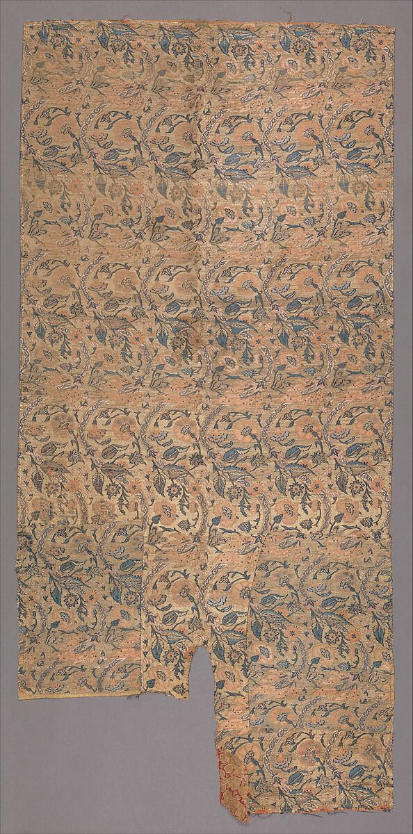 During the seventeenth century, rows of flowering plants became fashionable designs for textiles in Iran, India, and Turkey. In this early example, a design of undulating white stems (originally silver) and branches of roses, irises, and other flowers are set against a background of gold. Safavid weavers of this period were particularly adept at creating the sense of a continuous composition out of repeating design units and Safavid textiles were among the finest and most popular fabrics sold locally and on the international market.