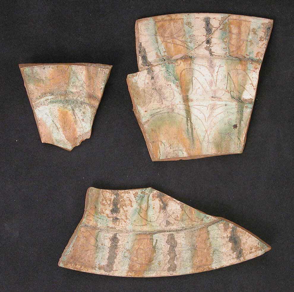These ceramic fragments were excavated a Qasr-i Abu Nasr, an archaeological site now attached to modern Shiraz in southern Iran. The small town and fortress were located at a strategic point at the intersection of protective mountains, water sources, and along roads entering the plain. The site was occupied, at least intermittently, from the Parthian period (3rd century B.C.–3rd century A.D.) to the Muzaffarid period (13th–14th century A.D.). The major occupation, including the extensive fortress, dates to the Late Sasanian period (6th–7th century A.D.).