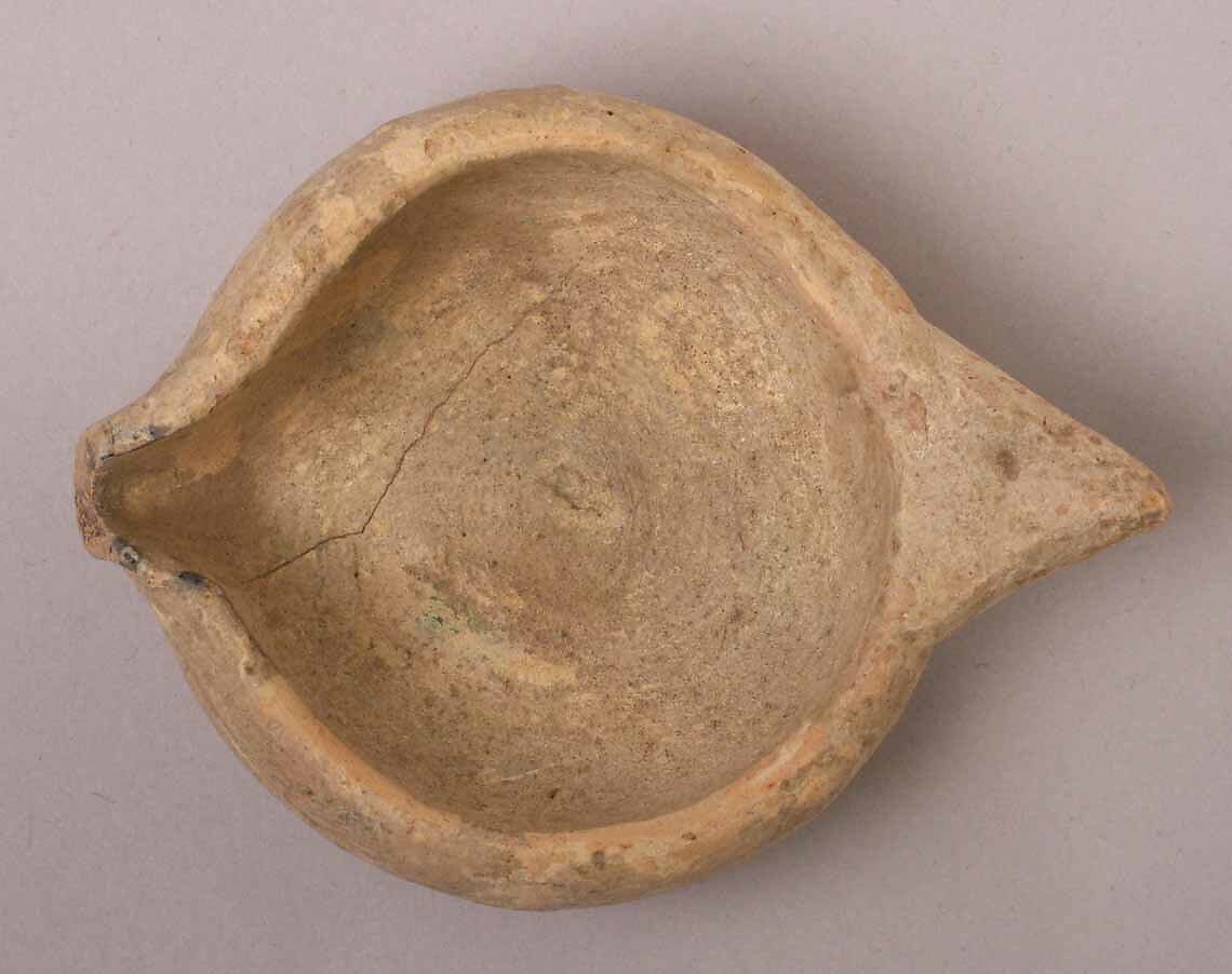 This ceramic lamp was excavated a Qasr-i Abu Nasr an archaeological site now attached to modern Shiraz in southern Iran. The small town and fortress were located at a strategic point at the intersection of protective mountains, water sources, and along roads entering the plain. The site was occupied, at least intermittently, from the Parthian period (3rd century B.C.–3rd century A.D.) to the Muzaffarid period (13th–14th century A.D.). The major occupation, including the extensive fortress, dates to the Late Sasanian period (6th–7th century A.D.).