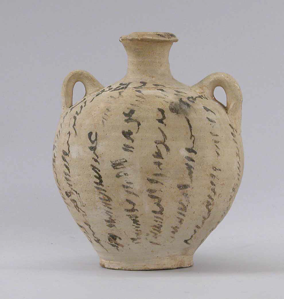 This double-handled jar bears inscriptions in black ink, written vertically to cover the entire vessel’s body. Although difficult to decipher, the inscriptions seem to repeat similar phrases, possibly with the formula basmala (in the name of God), a pattern that recalls the apotropaic writings on earlier bowls and on Islamic-period magic and talismanic devices in a variety of media. The jar was found together with a similar example (33.175.177) near the Buyid-period building. If this was indeed a shrine, and if the finding location relates to the jars’ use, it is tempting to suggest that the devotional use of the space was connected to the function of these magic vessels.