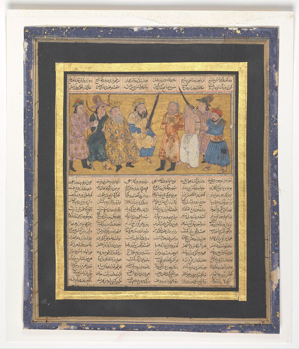 This illustration from the Shahnama shows Kai Khusrau on his throne holding the sword with which he will execute Afrasiyab for the murder of Siyavush, bound and standing before him. Next to Afrasiyab is his brother Garsivaz, the actual murderer of Siyavush, and behind him is an executioner with his sword drawn. The elderly Kai Kavus, grandfather of Kai Khusrau, is seated beside his grandson. In spite of the grim scene, the style is delicate and courtly, as befits its origins in an important cultural center, possibly Baghdad which rapidly became a prominent Ilkhanid city after it was taken and partially destroyed by the new rulers in 1258.