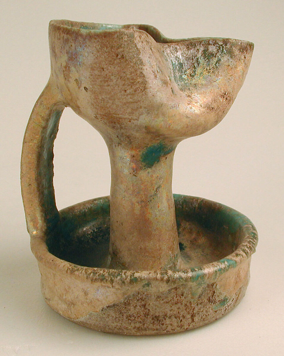 The type of oil lamp represented by this example excavated from Nishapur in eastern Iran may have evolved as a response to issues of portability. The tall stem and large handle allow it to be carried with ease. The saucer-shaped base not only helps to stabilize the piece but would also catch any oil that spilled from the sides of the lamp. Finally, the tightly pinched spout served to hold the wick steady. This type of portable lamp one of several forms found at Nishapur, speaking to a number of creative solutions to the problem of lighting employed at the site.