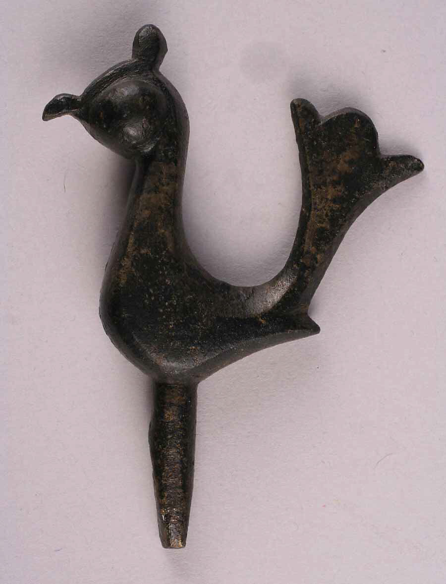 Several decorative metal finials such as this piece were found during the Metropolitan Museum’s excavations at Nishapur in eastern Iran. The elongated stem at the bottom suggests it may have formed the top of a pin used to arrange clothing or hair, several examples of which were found at the site. Bird-shaped finials were particularly popular at Nishapur and in addition to pin tops, such finials were found attached to the handles of lamps and incense burners, as well as to lids for various vessels.
