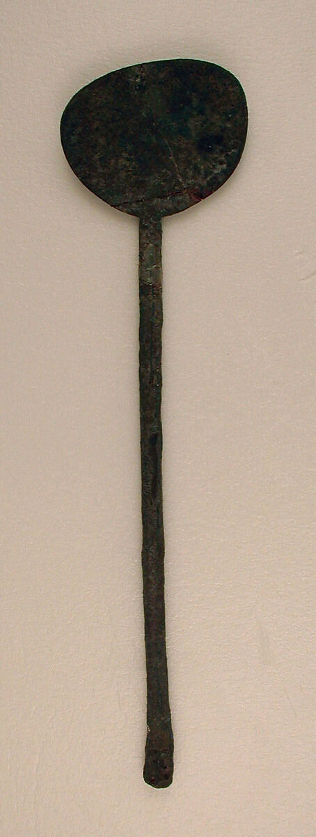 While very few metal spoons were unearthed during the Metropolitan Museum’s excavations at Nishapur in eastern Iran, three types are represented among the finds. This spoon is of a type characterized by a long handle and a small, relatively shallow bowl. Other shapes include spoons with flat handles and flat bowls, and one with a deeper, ladle-like bowl. The typology and function of tableware in the early Islamic world is still being worked out, and archaeological excavations in domestic contexts like those conducted at Nishapur are particularly important for increasing our understanding of the history of household utensils.