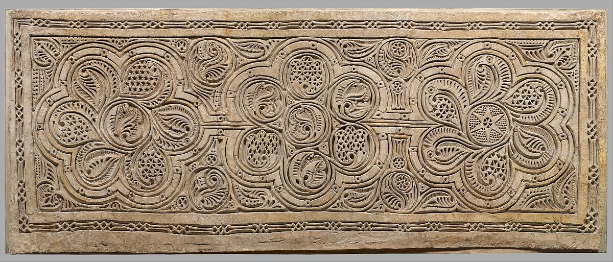 This carved plaster panel comes from an elaborately decorated house excavated at Nishapur, which had panels decorating the lower part of the wall (called the dado) in several rooms. The panels were originally painted in bright yellows, reds, and blues, with equally colorful murals on the plaster walls above. However, once the excavated panels were exposed to air, the bright colors quickly disappeared. It appears that to create these dado panels, a thin layer of stucco was applied to the wall and the design was sketched out using a compass and other drawing tools. Then the design was carved into the surface by hand. This is different from the findings at other sites, where it appears that large panels of stucco were made from a mold and then attached to the wall with the designs already impressed on them.