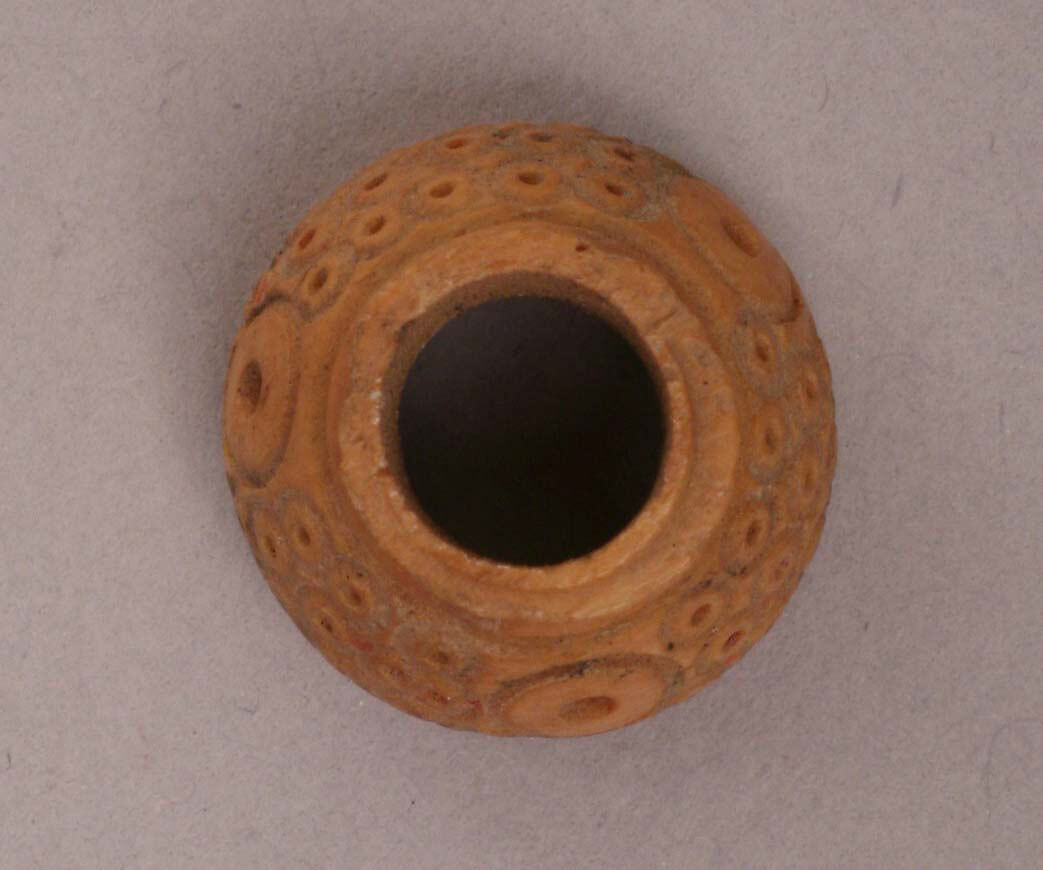 The dot-in-circle motif recalls designs presumed to be of magical significance, most likely an abstract eye to ward off the evil-eye, which serves an apotropaic function. Easily reproduced with a tool and visible in many cultures and times, this symbol may have lost its meaning, and become simply a decorative pattern, or may have one that we have not yet discovered.