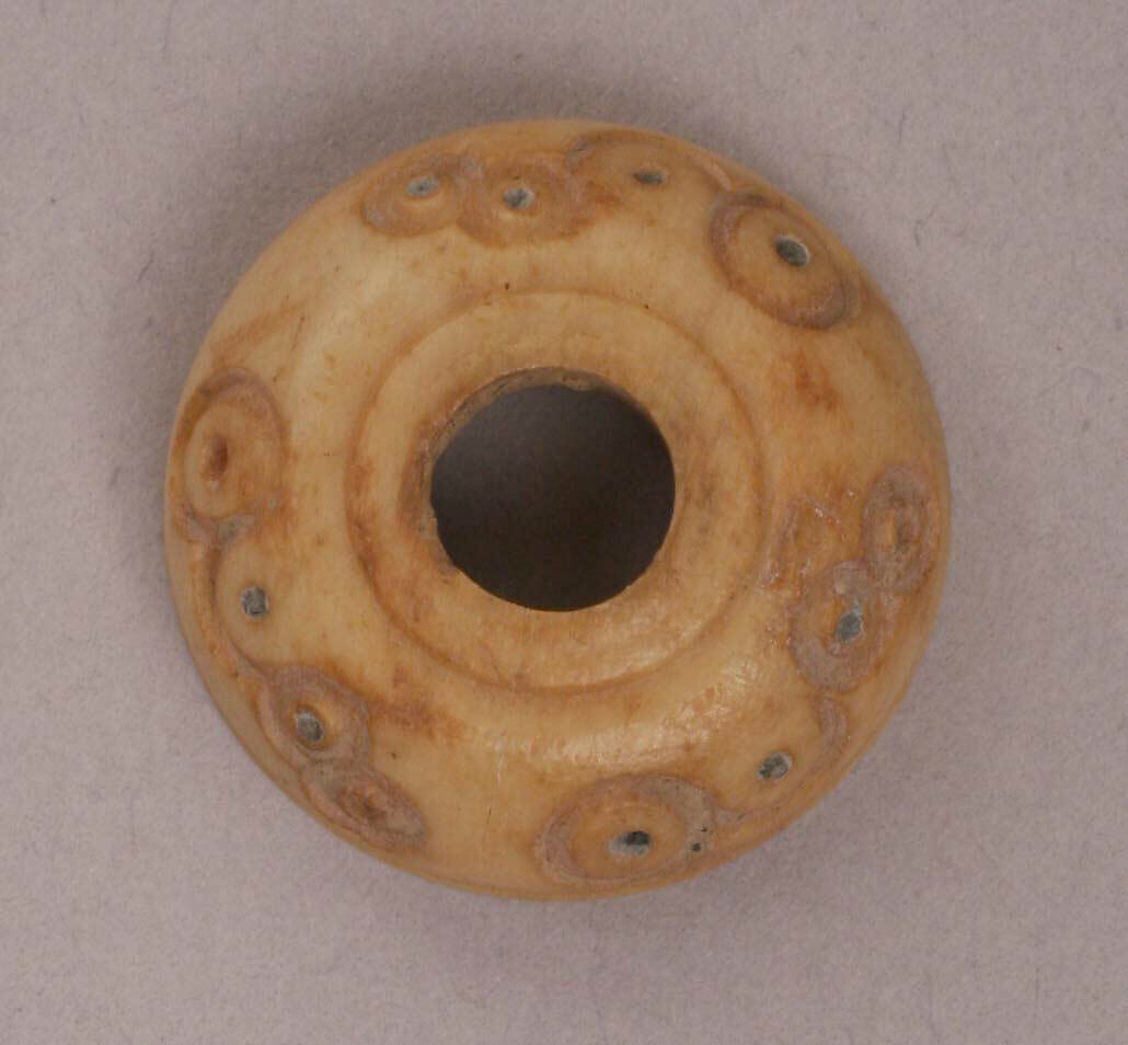 The dot-in-circle motif recalls designs presumed to be of magical significance, most likely an abstract eye to ward off the evil-eye, which serves an apotropaic function. Easily reproduced with a tool and visible in many cultures and times, this symbol may have lost its meaning, and become simply a decorative pattern, or may have one that we have not yet discovered.