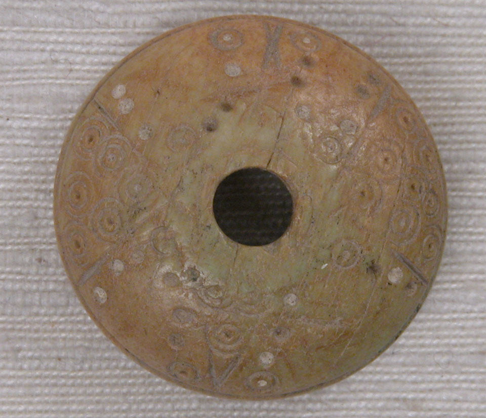 Button or Spindle Whorl, Bone; tinted, incised, and inlaid with paint