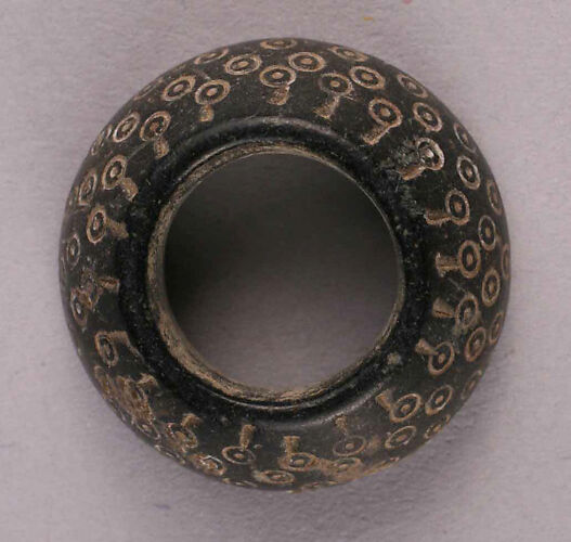 The dot-in-circle motif recalls designs presumed to be of magical significance, most likely an abstract eye to ward off the evil-eye, which serves an apotropaic function. Easily reproduced with a tool and visible in many cultures and times, this symbol may have lost its meaning, and become simply a decorative pattern, or may have one that we have not yet discovered.