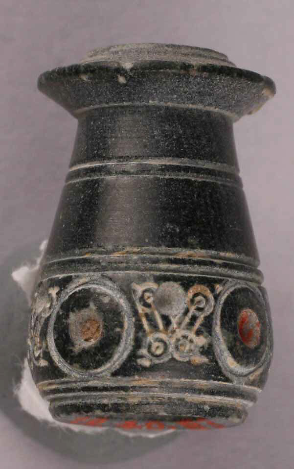 - Medium: Stone, probably jet; incised and inlaid with paint