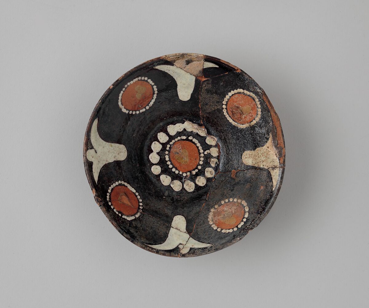 Bowls made with boldly colored slips (diluted clay) were made throughout the area surrounding Nishapur. These slip wares are easily distinguished from the ceramics produced in the rest of the Abbasid Empire, and bear no relation to the popular Chinese-style ceramics also produced in Nishapur. Similar rosettes decorate bowls from other nearby sites, including Samarqand, but the peculiar leaf design is more common in the finds from Nishapur. This small bowl was probably made for daily household use.