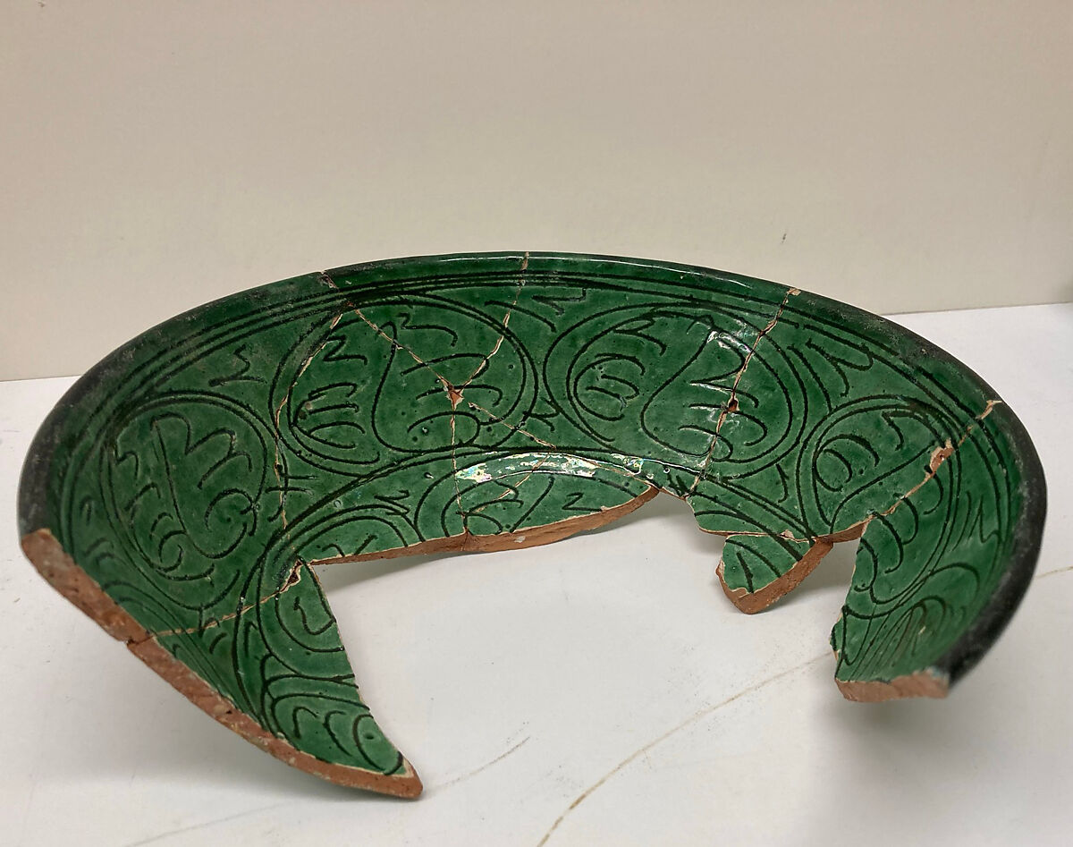- Medium: Earthenware; white slip, incised under transparent green glaze