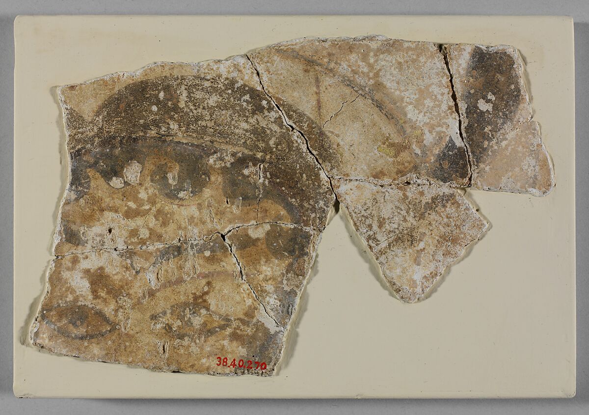 Colored with blue, yellow, black and traces of red, this fragment from a wall painting was excavated from the mound at Nishapur known as Sabz Pushan (the Green Covered). The excavations at Sabz Pushan revealed part of a residential neighborhood dating to the tenth century. This and several similar fragments were found deposited in the bottom of a well dug into the floor of what was likely a domestic unit after having been chipped off a wall and discarded, so their original location is not known. Several are now housed in the Metropolitan Museum, and include 38.40.267, 38.40.268, 38.40.269 and 38.40.271.
