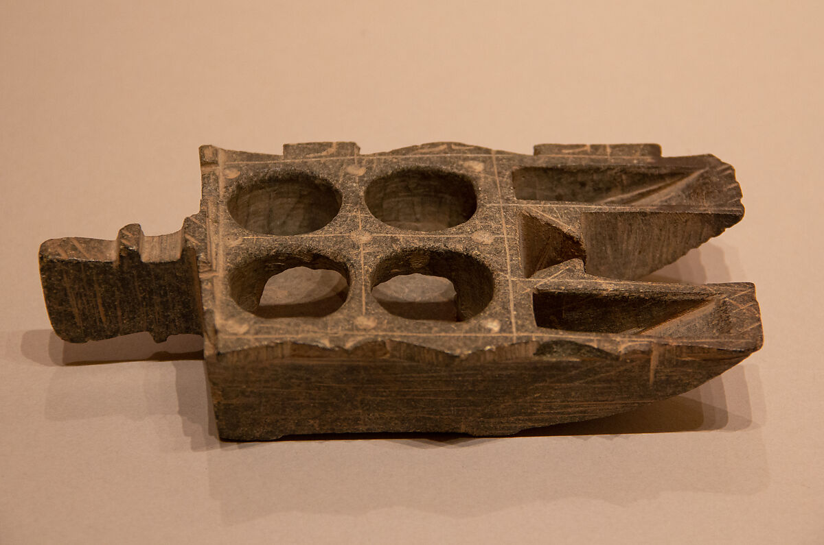 The carving of utensils and other objects from soft stones is part of a longstanding artistic tradition in the Near East that dates back for millennia. Steatite and other related talcs (the English word is of Persian origin) are easy to carve, relatively strong and non-brittle, and are impervious to fire. Many of medieval Nishapur's stone utensils demonstrate a high degree of artistic merit, despite having been fashioned from a lowly material and serving a utilitarian function. These pieces often have powerfully sculptural forms with silhouettes that take the form of beautiful two-dimensional patterns. This lamp, of gray black "Mashhad" stone, is rectangular in shape, its one end terminating with two prongs in an upturned curve (giving it a boat-like appearance) and a short handle carved out the other. The lamp is divided into two longitudinal sections with seven cavities--four circular 'bowls', a semicircular one between the two elongated receptacles of each terminal prong.