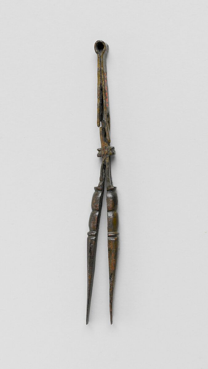 Tweezers were widely used in the ancient Near Eastern and Roman worlds and were commonly fashioned out of single piece of metal. These tweezers are made of a single piece of bronze with a separate adjustable sliding piece for altering the opening distance.