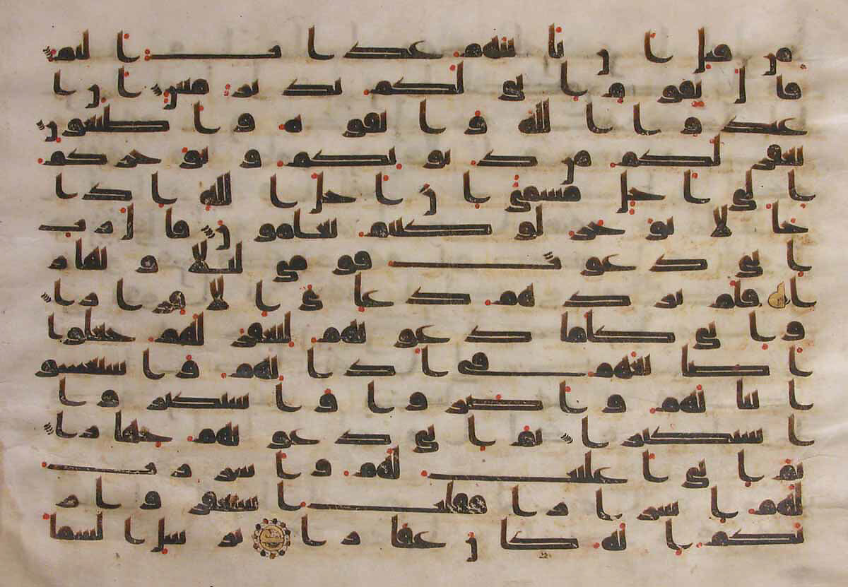 Like many early Qur’an folios, this example is written in parchment in black ink using a broad-nibbed reed pen. The emphatically elongated letters seen here are characteristic of early kufic Qur’ans on parchment, and are thought to be a response to the shift to the horizontal format of the rectangular page. The angular script is moderated by the roundness of several letters that look like large black dots, their inner blank spaces reduced almost to a needlepoint. Red dots indicate the vowel marks, while rosette patterns mark the ends of verses.