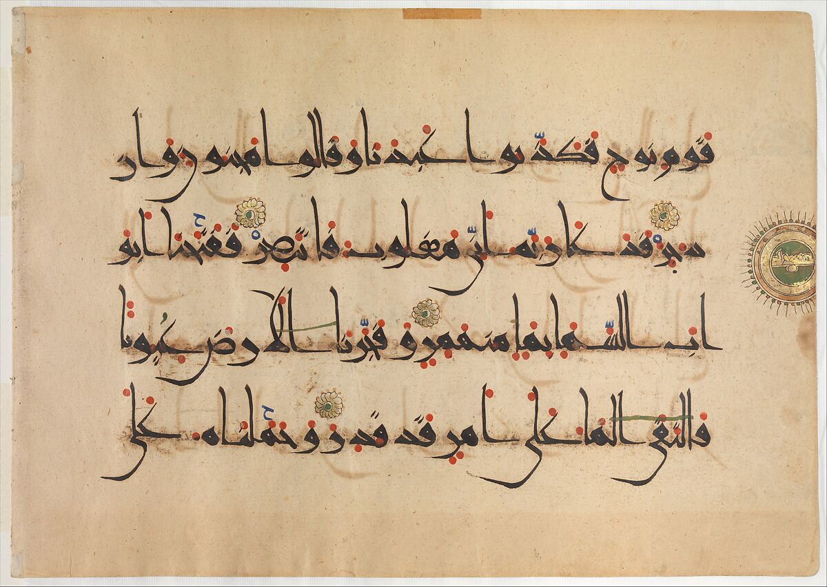 The first centuries in the copying of the Qur’an witnessed a succession of changing styles in the manuscript’s calligraphy, decoration, and format. This Qur’an shows many of the changes taking place in the medieval period. Whereas earlier Qur’ans were made of parchment and inscribed in a relatively simple kufic script, this manuscript was created of paper and of an angular script known as "new style script". The folios belong to the last volume of a four-part Qur’an manuscript, other folios of which provide the date of AH Ramadan 383 / AD October–November 993 and indicate that it was copied in the Iranian city of Isfahan. In both its medium and calligraphy, these folios reveal the increasing cultural pull of the eastern edge of the Islamic world, a decided shift from the earlier, Mediterranean- focus of the first Islamic centuries.