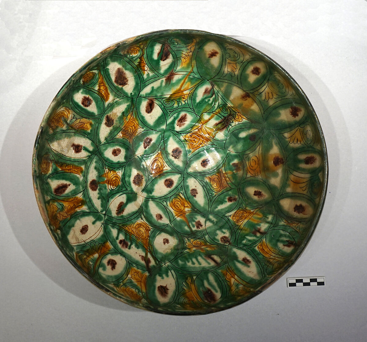 - Medium: Earthenware; white slip, incised and splashed with polychrome glazes under transparent glaze (sgraffito ware)