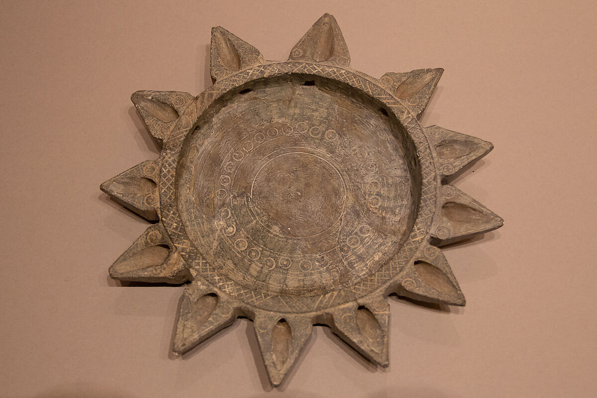 The carving of utensils and other objects from soft stones is part of a longstanding artistic tradition in the Near East that dates back for millennia. Steatite and other related talcs (the English word is of Persian origin) are easy to carve, relatively strong and non-brittle, and are impervious to fire. Many of medieval Nishapur's stone utensils demonstrate a high degree of artistic merit, despite having been fashioned from a lowly material and serving a utilitarian function. These pieces often have powerfully sculptural forms with silhouettes that take the form of beautiful two-dimensional patterns. This lamp made of "Mashhad" stone has a circular well and twelve triangular flanges for holding wicks. The well and flanges are incised with circles with dots at their center. The rim of the well is incised with cross-hatched lines.