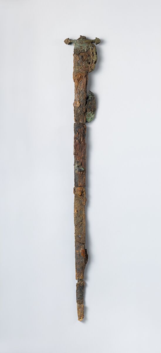A surprise find from the Tepe Madrasa area, this is one of the earliest Islamic-period swords known from Iran. The sword has an iron blade and was adorned with gilt-bronze elements on the cross guard and quillon. Parts of its wooden scabbard remain fused to the blade, which also was decorated with gilt-bronze mounts at the center and tip. The form of this sword, with its straight, double-edged blade, seems to be a Central Asian type.