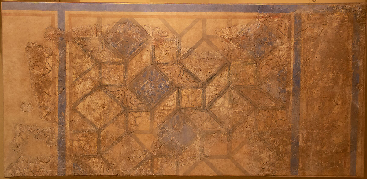 Although the linear drawings inside the compartments have been transformed into half-palmettes and other designs, their origin in an attempt to imitate marble seems likely. The pattern of the layout is closely related to one which was popular in Roman floor mosaics.