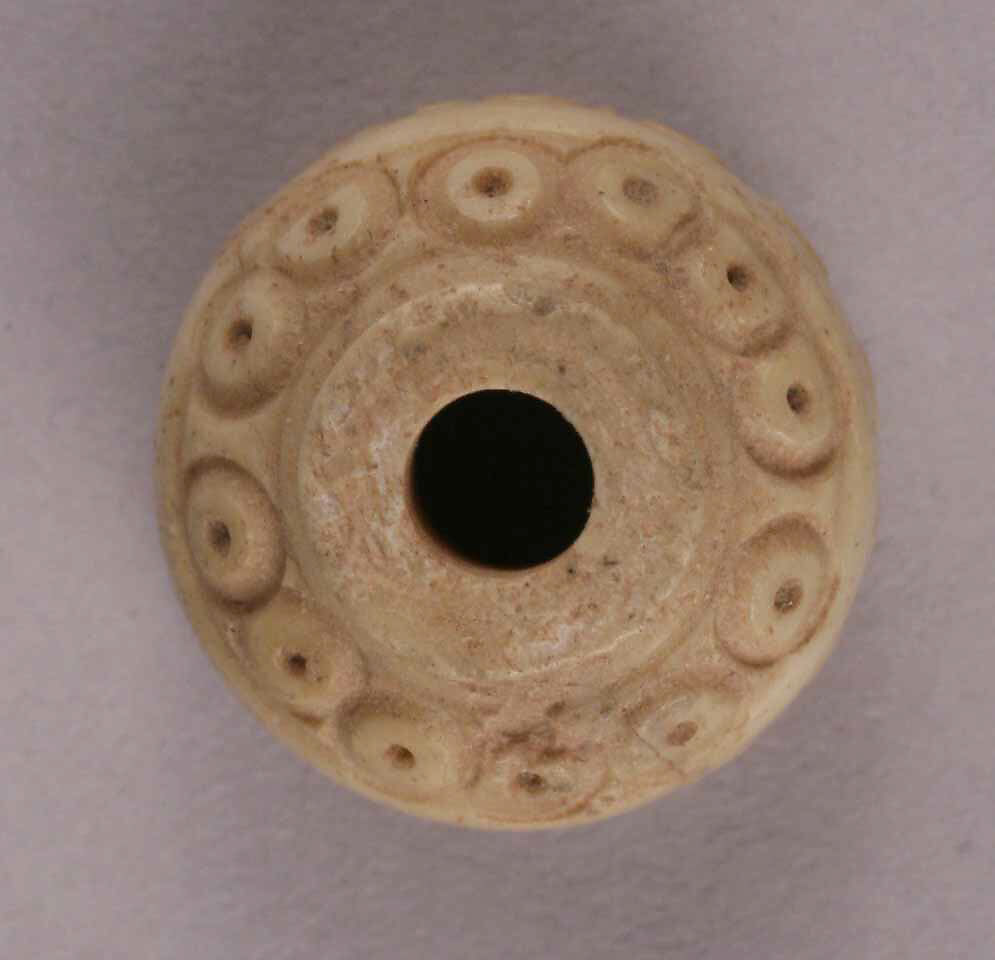 Spindle whorls aided in the making of thread by maintaining the momentum of the spindle. This round bone spindle whorl with a raised collar was excavated at Nishapur. It is decorated with two bands of dot-in-circles bordered by incised lines. The dots were filled with black paste at one time, but the filling has since been lost. Hundreds of spindle whorls were excavated at Nishapur, providing further evidence that the city possessed a thriving textile industry. Their incised designs exhibit a wide variety of motifs ranging from geometric forms to zoomorphic figures.