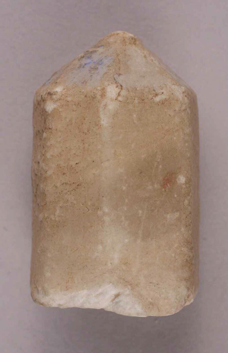 This chess piece was excavated in Nishapur, Iran in 1937 at the site of Sabz Pushan—a thriving residential neighborhood throughout the 9th and 12th centuries. Made from carved alabaster, the formal elements of this object, such as its seven-sided base and elongated prismatic shape, suggests that it functioned as a pawn. The traces of black lines and blue pigment on the alabaster stone serve as evidence that it was originally painted. It is one of many objects acquired by the Museum through a division of finds with the Iranian government.