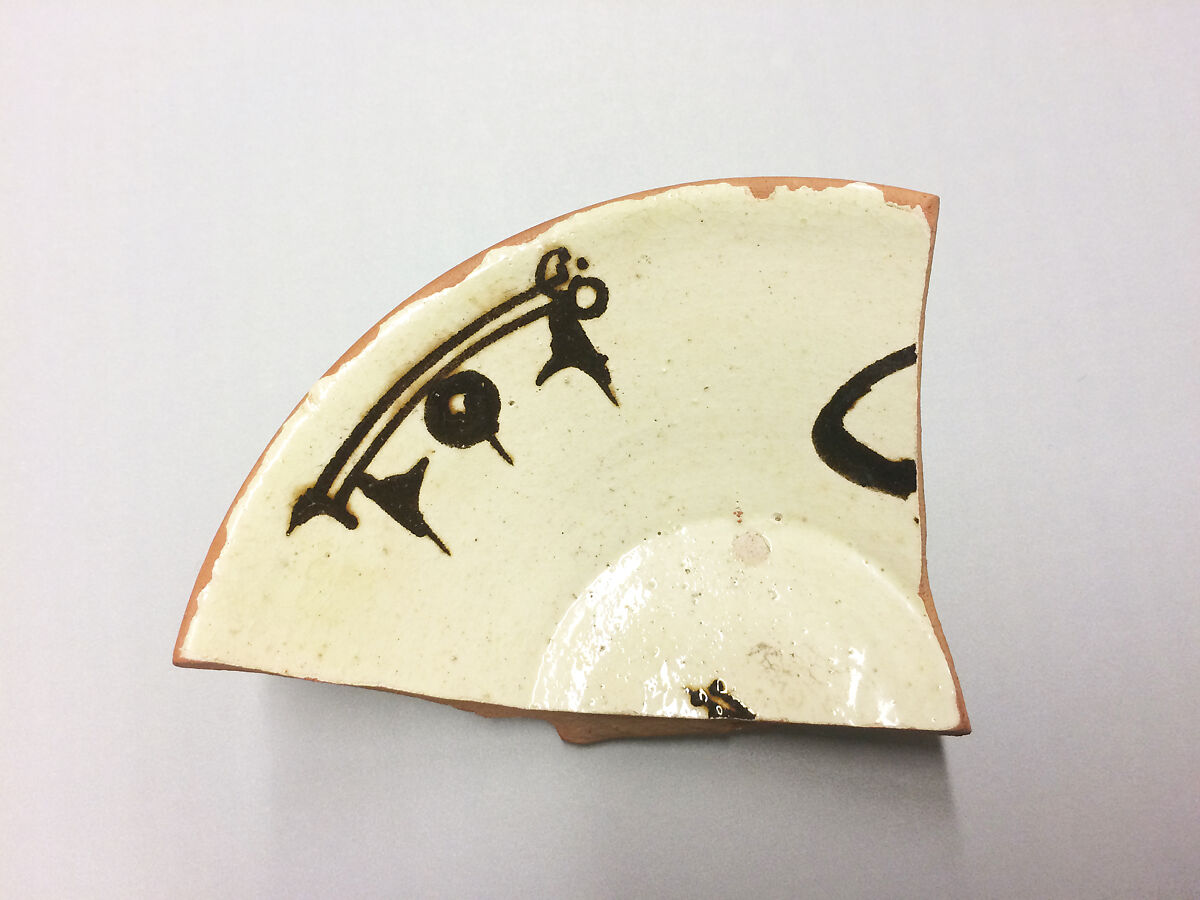 - Medium: Earthenware; white slip, brown-black slip decoration, glazed