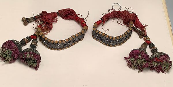 Jewelry in India was not restricted to wealthy members of society, but rather produced with varying materials to appeal to a range of economic classes. This pair of armlets, or bazubands, were made with a dark metal alloy, embellished with beige, red, magenta, and lime-green colored threads, and would have been owned by someone with modest means. The metal has been incised and decorated with floral forms, which are articulated, allowing for the movement of the wearer. Such jewels were worn on the upper bicep, and the metal and polychrome fabric tassels would have embellished the back of the arm.