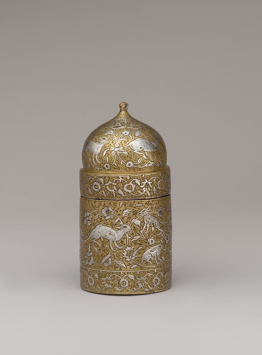 This cylindrical dawat (inkwell) with a domed lid once fit into a metal penbox, where it was secured by a line of soldering along its seam. Inlaid silver forms the primary decoration of floral vines and animals, and engraved and chased floral patterns occupy the background. A piercing in the lid suggests that a ring may have once eased the opening and closing of the inkwell. Referenced in Persian poetry and histories as early as the tenth century, cylindrical inkwells with domed lids were produced in great numbers in twelfth to sixteenth century Iran.