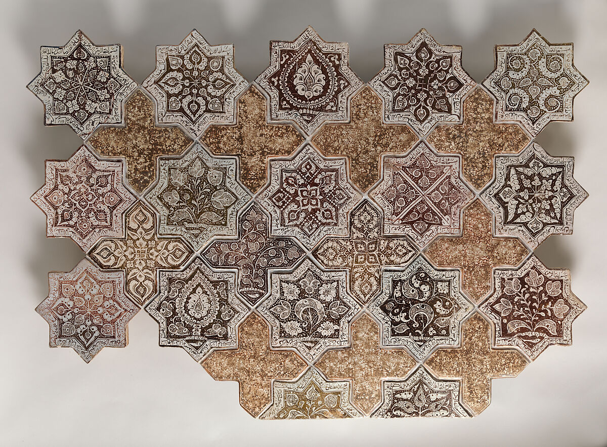 Panels composed of eight pointed stars and crosses commonly adorned walls of religious architectural sites in Iran during the Ilkhanid period. The intricate patterns on these tiles are luster-painted in a brownish-red on white opaque glaze. In this example, the cross-shaped tiles with a plain design were constructed in the twentieth century to replace missing ones when the panel was assembled. At the center of these tiles, we see abstract vegetal patterns, a motif that is consistent with ceramics and tiles from Iran during that period. In addition, there are figural depictions of fish in some of the tiles that have a deeper ontological significance. All of God’s creation such as animals, plants, and stones were believed to emanate from the same cause and therefore related on an ontological level.