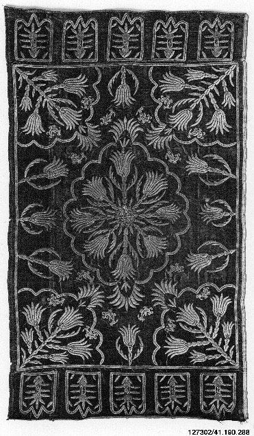 Medium: Silk velvet; embroidered with metal wrapped thread