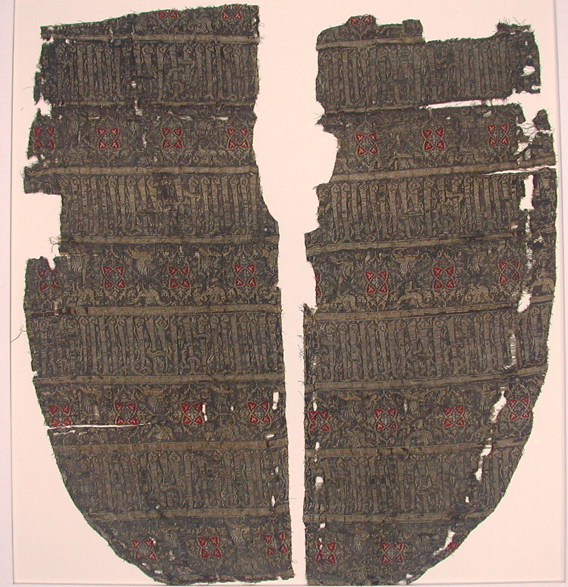 This fragment is likely from a lavish textile either a chasuble or a reliquary cloth used in the Cathedral of St. Mary of the Assumption in Chur, Switzerland where its sister fragment is preserved in the Cathedral’s treasury. It is a highly luxurious fabric woven with fine silk and silver-gild metallic thread. Calligraphic golden bands with scrolling vine-leaves in the back – some of which end in animal heads – are woven against a purple-blue satin ground. They alternate with bands decorated by quatrefoil medallions in crimson red surrounded by fantastic beasts, such as dragons and griffins. While the repeated inscribed words in Arabic of ‘al-Sultan al-Malik [al-Nasir] suggest an attribution to Mamluk Egypt under Sultan al-Malik al-Nasir Muhammad ibn Qalawun (r. ca. 1293–1342), the animals and script also resemble those found in the eastern Islamic Lands, where under the Il-Khanids sophisticated textiles were woven as gifts for their Mamluk rivals. However, the inner architecture and technique of this textile reveals structural affinities with European, particularly Italian textile manufacture. This is further supported by a peculiar stylistic rendering of the vegetal details in this textile, which does not compare with examples from the Islamic world. An Italian production also would explain the misspelling of the Mamluk honorific titles.