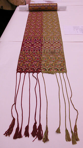 While sashes are decorated with a wide variety of design patterns, the ornament typically begins with a plain border two to three centimeters wide, followed by a section with the so-called "hand of Fatima" or "khamsa" pattern. While mostly worn in Muslim ceremonies, sashes like this one may have been woven by Berbers or Jews living in nearby communities, who were known to manufacture some of the finest Moroccan textiles.