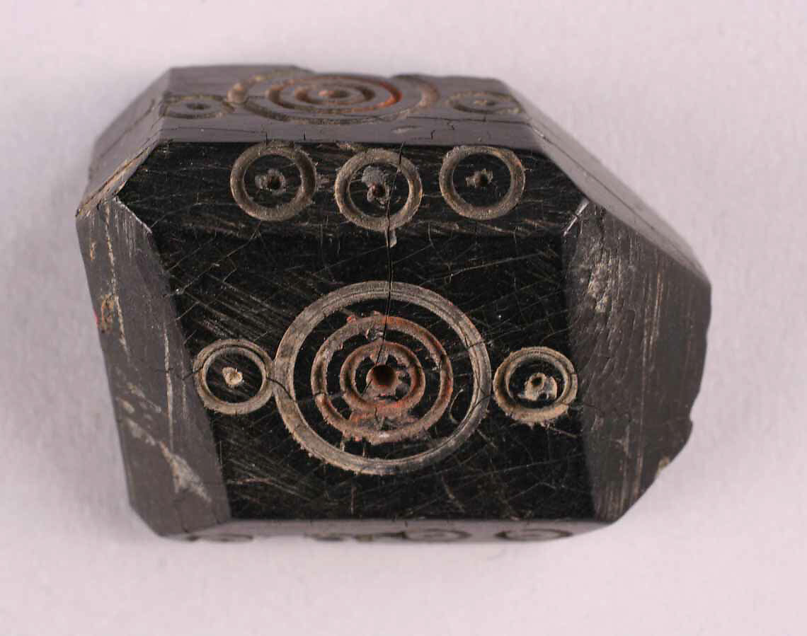 - Medium:Black stone, probably jet; cut and drilled