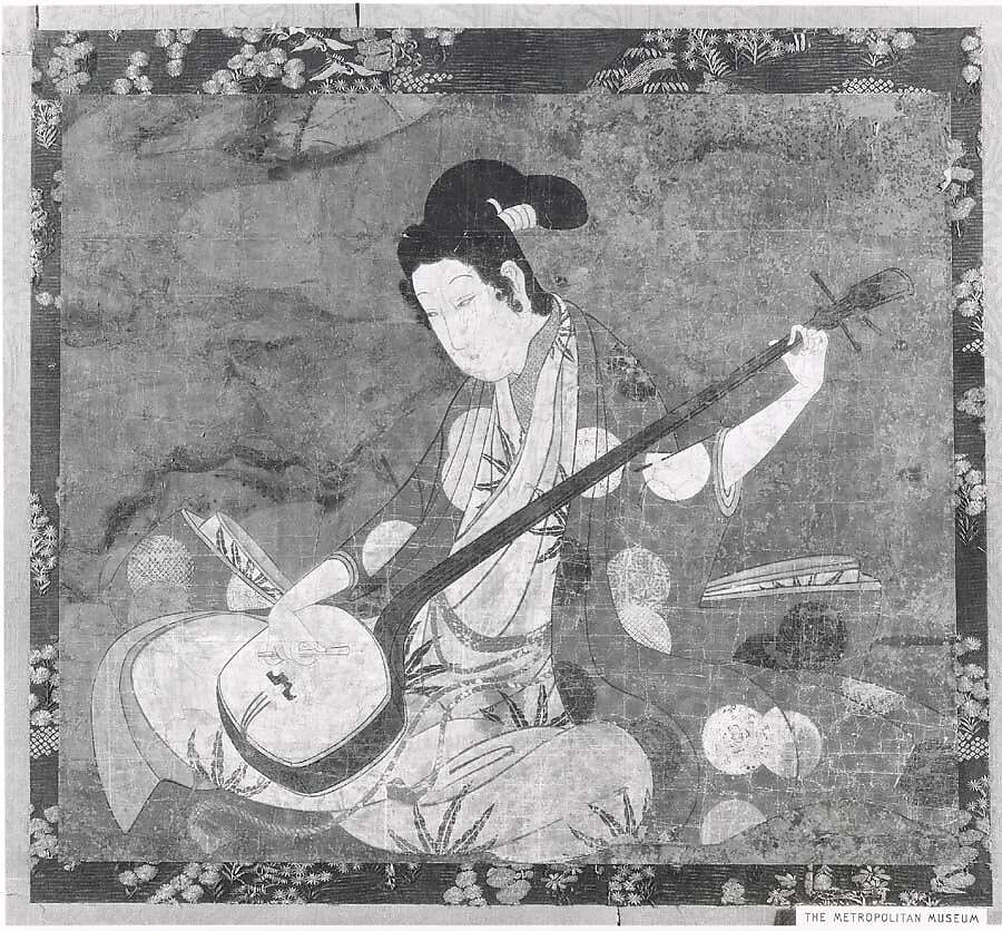 At one time part of a larger composition, perhaps of outdoor merrymaking, this image of a woman plucking a samisen captures the pathos that underlies a scene of pleasure. The three-stringed lute, adapted from an instrument imported from the Ryūkū Islands in the mid-sixteenth century, was associated with the Edo-period world of pleasure quarters and theater.