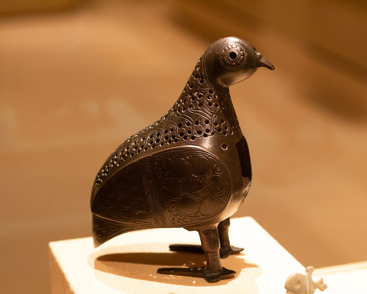 Incense was widely used in the medieval Islamic world. At receptions and special events, servants would waft the guests with the aromatic smoke emanating from the openwork of the incense burner and sprinkle them with drops of scented water. This bird‑shaped incense burner represents a class of metalwork that would have been sold at market. Birds figure prominently in the decorative repertoire of the Seljuq period, and were probably associated with good fortune.