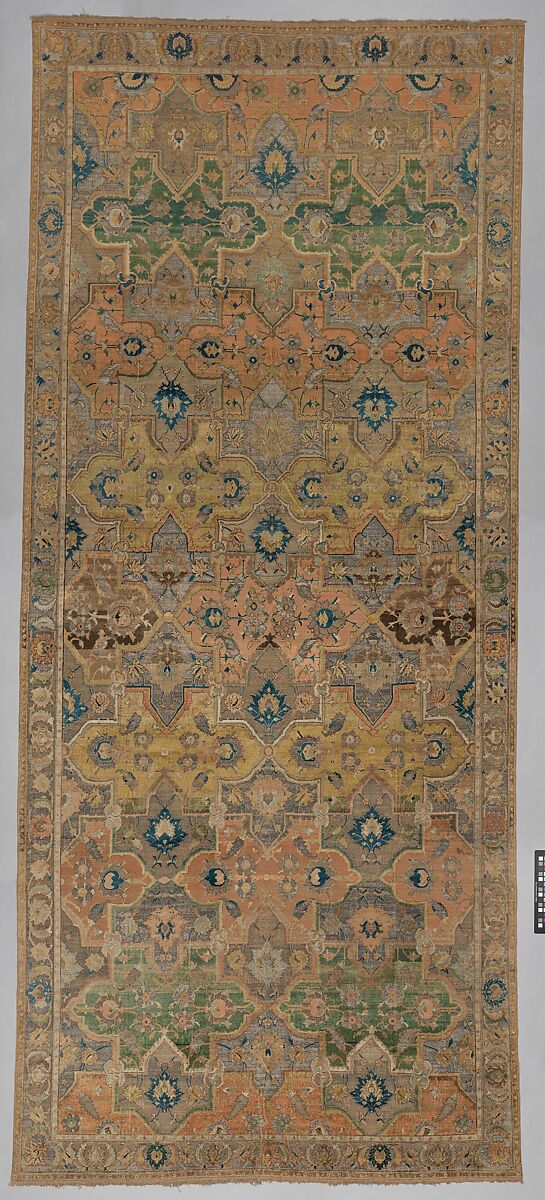 This carpet, one of a matching pair, belongs to a type known as "Polonaise," noted for its silk pile, pastel color palette, and extensive use of gold- and silver-metal-wrapped thread. The designation "Polonaise" reflects the (incorrect) nineteenth-century belief that carpets of this type were from Poland, a notion derived from the presence of similar carpets bearing European coats of arms. In fact, these carpets were made in Iran and shipped abroad in large numbers. Many were also brought to Europe by Persian embassies as gifts from the shahs, and some were commissioned in Iran by visiting Europeans. Though Polonaise carpets are relatively common, the design of overlapping cartouches seen here is rare.