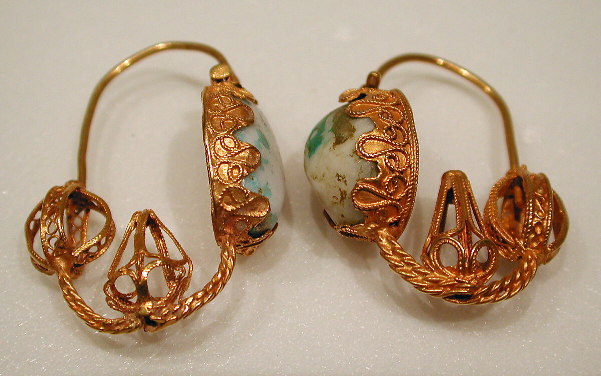Traces of bluish-green glaze can be seen on the surface of the quartz stones in these earrings in an effort to imitate turquoise. Sourced locally in Iran, turquoise was a favorite stone in the medieval period, and according to eleventh-century scholar Al-Biruni, was believed to protect from the evil eye. Glazing stones to modify their appearance is a practice that is known since antiquity and provided a more economical alternative to sourcing expensive gemstones.