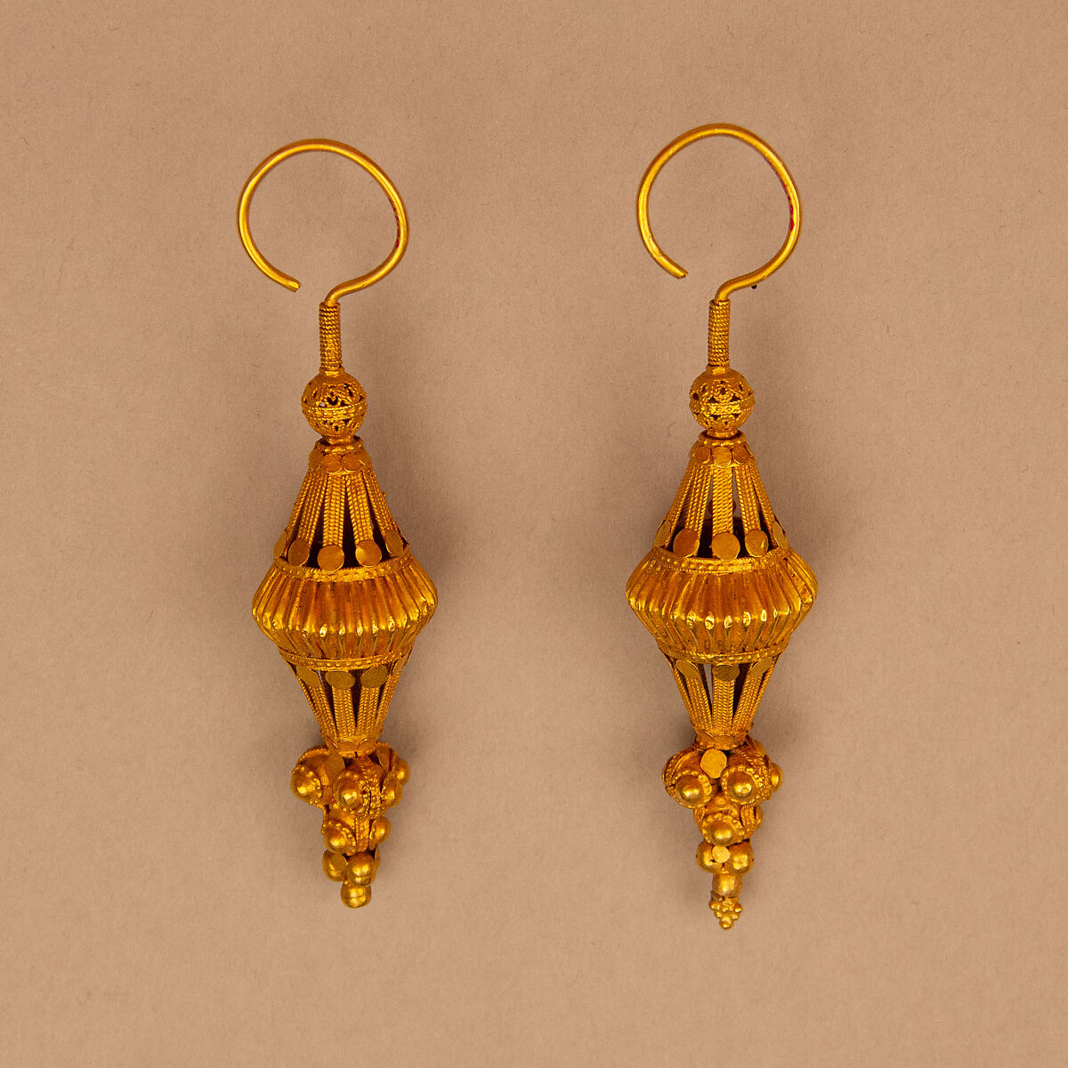 Ornaments of this double-conical shape are known from the region of eastern Saudi Arabia and Oman, where they were worn by Bedouin women. The cluster of gold granules on the bottom of the jewel are often understood as references to the mulberry fruit – a symbol of fertility, which has been used since antiquity to ornament jewelry in this region. Adornments such as these may have been worn as earrings (through the ear) or attached to a necklace or a headdress.