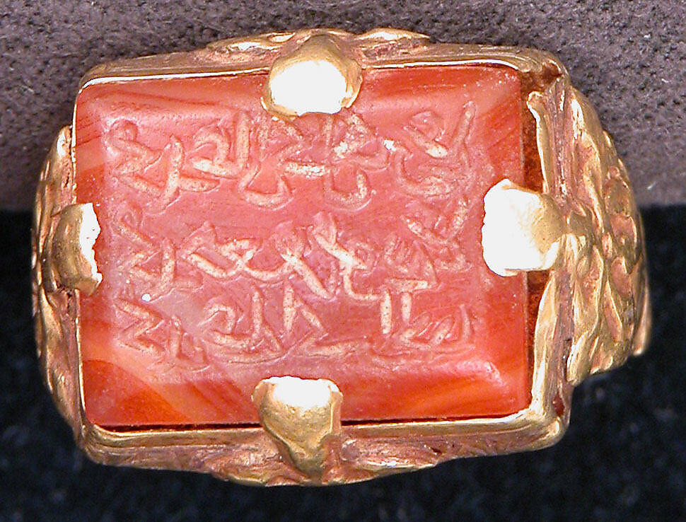 - Medium: Gold sheet and carnelian seal stone; incised