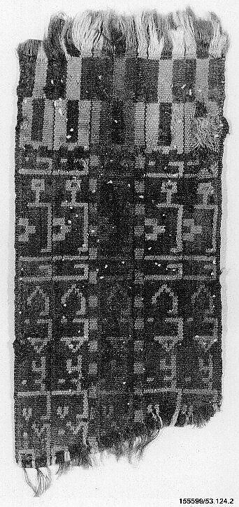 This wool fabric is highly colourful, with bands in cobalt, brown, dark blue, tan and red. The right edge has the original fringe and a checkerboard pattern. The inscription on the textile, executed in beige colour, is repeated in five horizontal bands and is a prayer to God (‘O who you are, I call him’). The heavy double weave of the fabric implies that it was most likely used as soft furnishings and not as a garment.