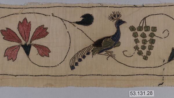 - Medium:Cotton; embroidered in silk and silver-gilt tinsel