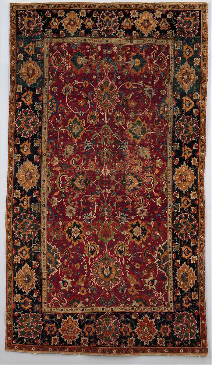 This type of carpet is characterized by a weft structure with four plies and a dense knot count, which explain the tightness and heaviness of the rug. Common Persian motifs are usually knotted in a rich palette with two to three different tones per color. Starting from the center, cloudbands, peonies, lotuses, and other flowers develop in spiral-like movements and are arranged following vertical and horizontal symmetrical axes. Contrasting ground colors—rich red and dark blue—accentuate the vibrancy of the rug and help distinguishing the border from the field.