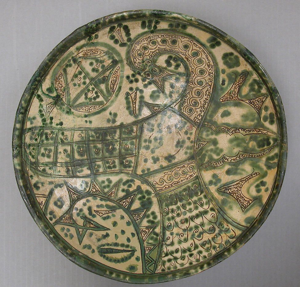 Amul ware is named after a town in northern Iran where early collectors obtained several examples of this type of ceramic, but the actual production site is unknown. These wares are coated with a thick creamy slip that is incised to reveal the reddish body beneath, highlighted with green pigments, and then covered in a transparent glaze.